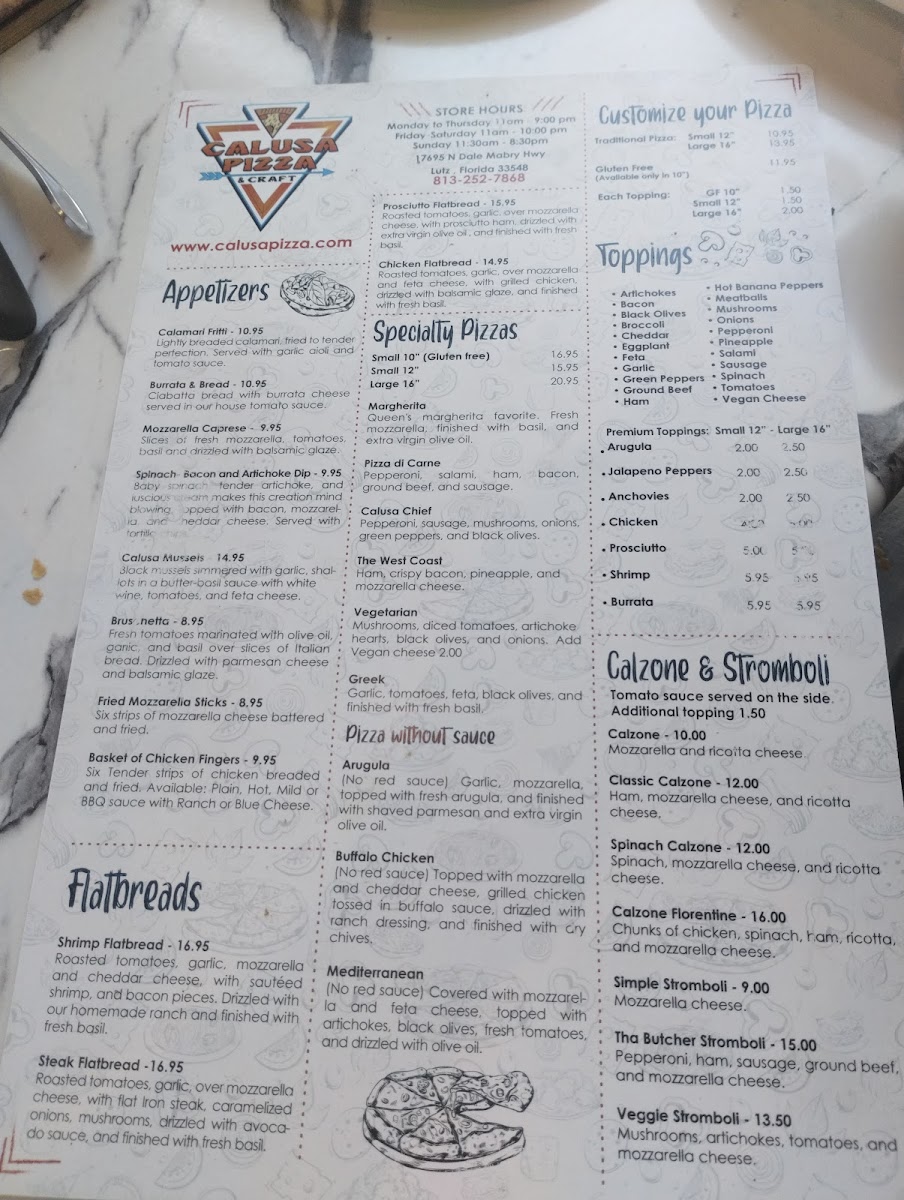 Welcome to Calusa Pizza & Craft, a culinary gem located at 17695 N Dale Mabry Hwy, Lutz, FL. This inviting restaurant redefines casual dining with a tempting menu offering everything from classic pizzas to gourmet appetizers. Begin your feast with delightful treats like Mozzarella Logs and Calusa Mussels, simmered in a rich butter-basil sauce. Their signature pizzas are customizable, catering to every taste—with options for gluten and dairy-free diners.